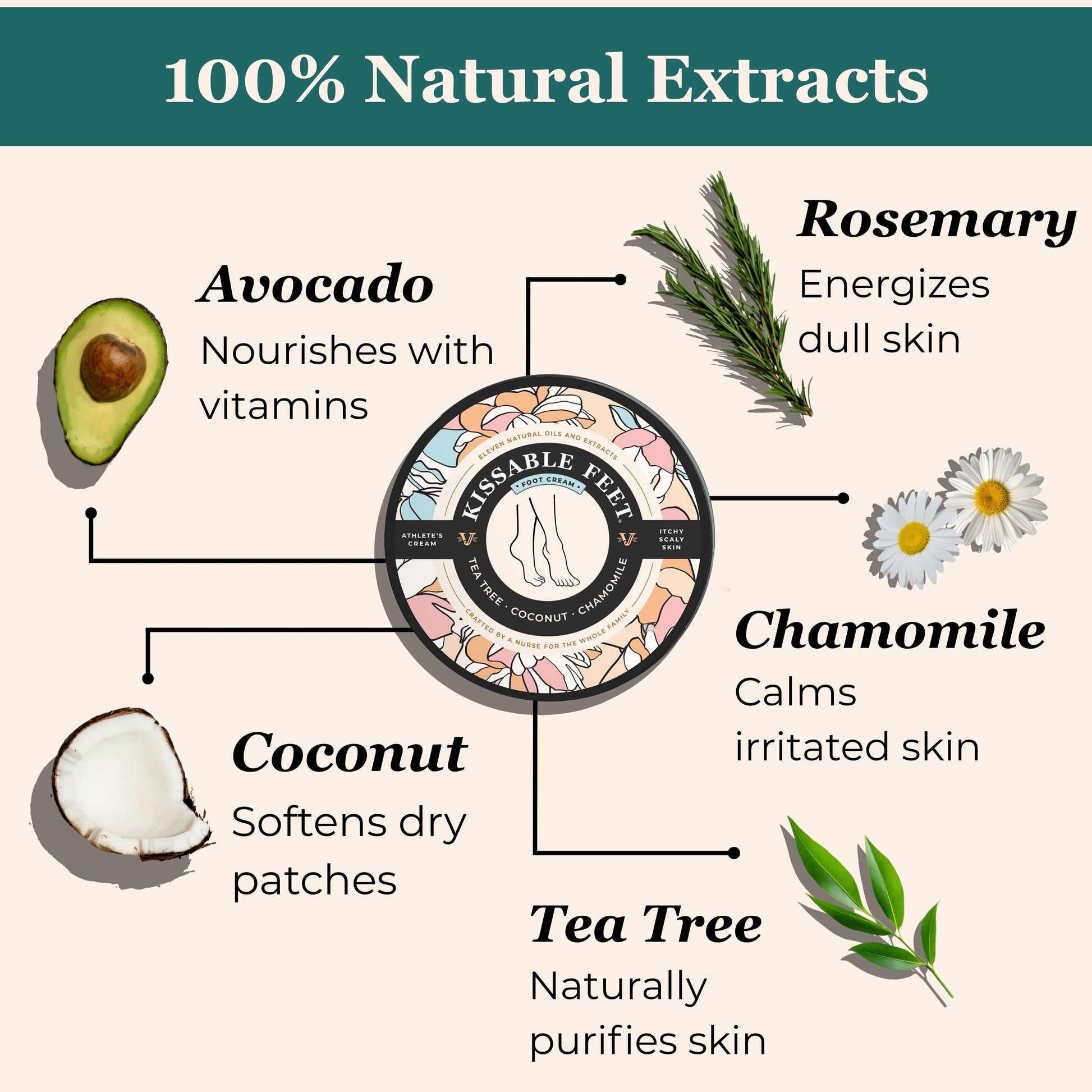 Crafted by a nurse and infused with a calming blend of tea tree oil, coconut oil, calendula, aloe, and chamomile, our antifungal formula targets athlete’s foot, foot fungus, and itchy cracked skin without the harsh burn of medicated creams.
